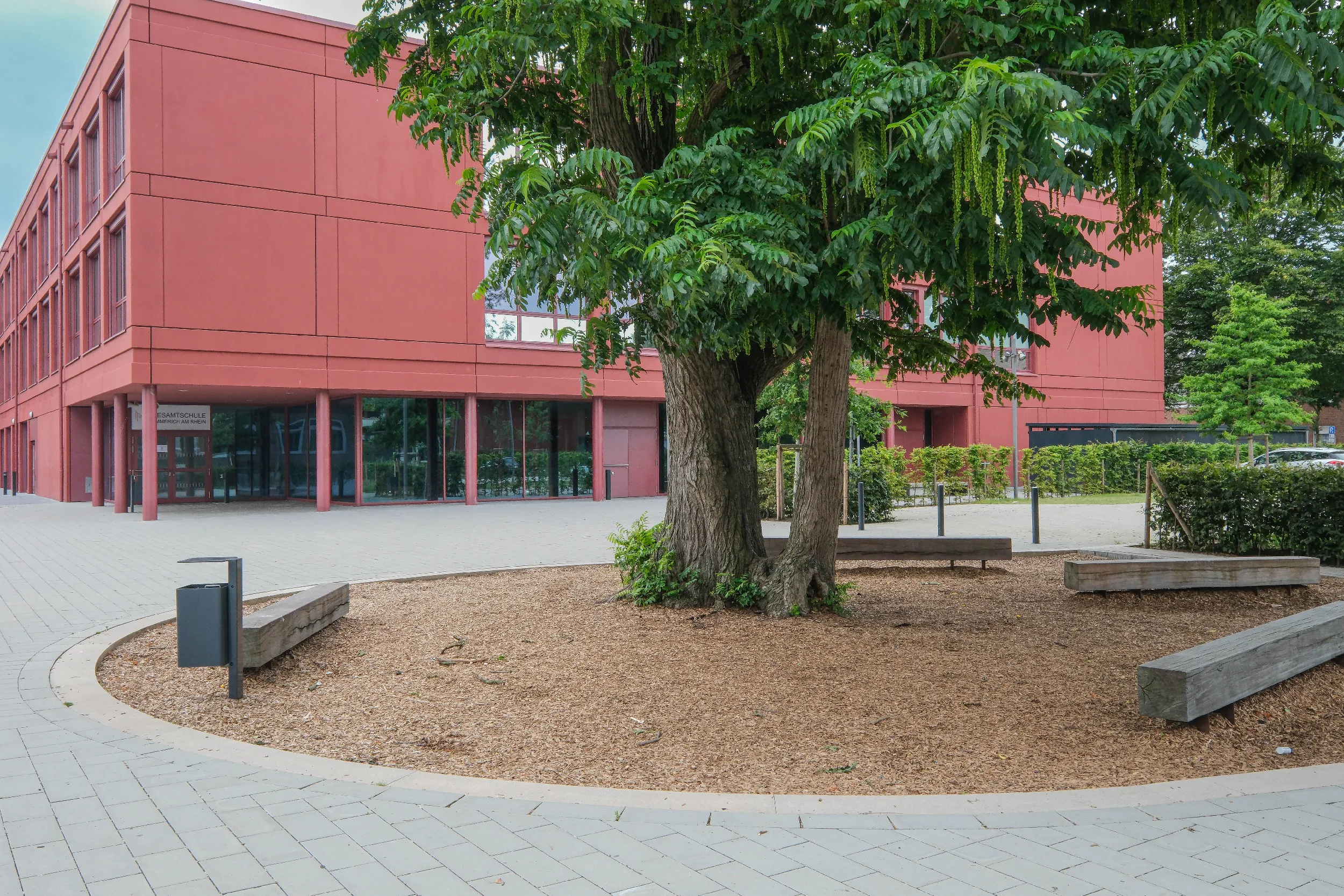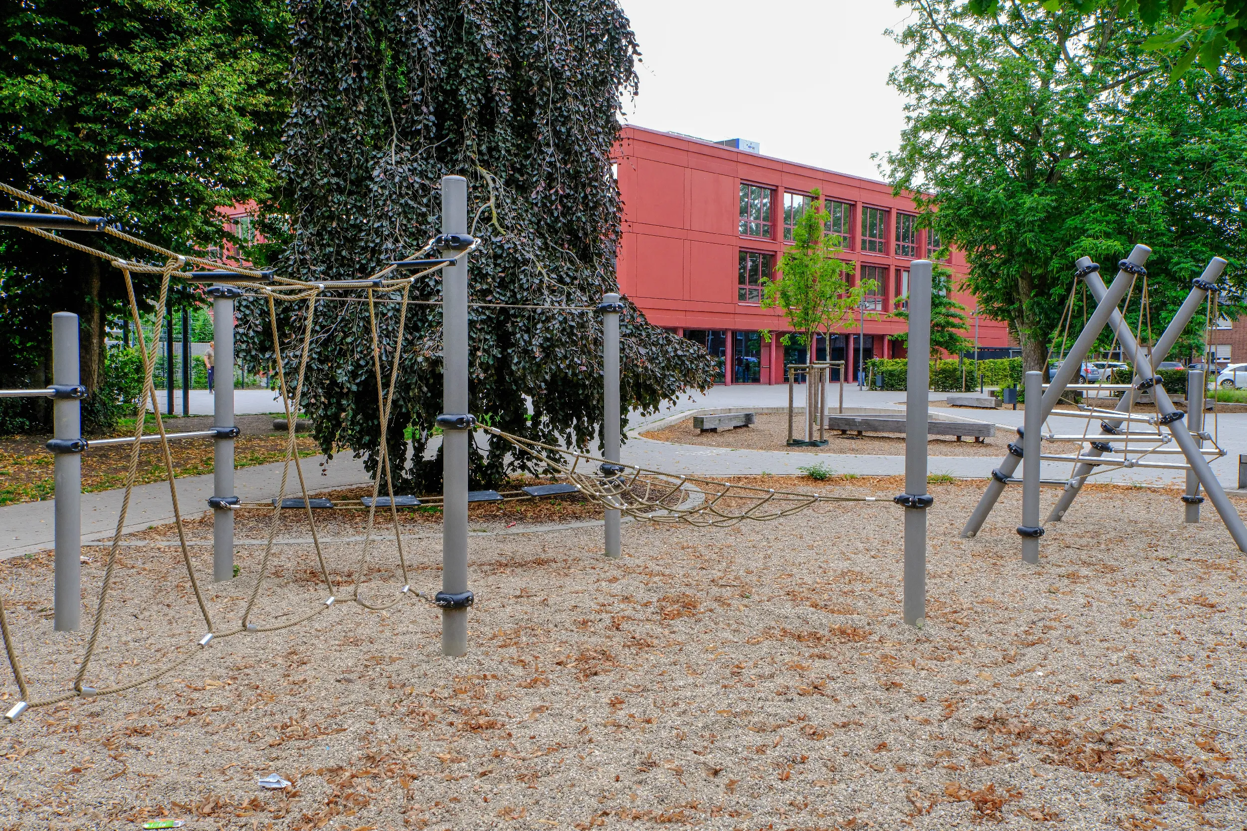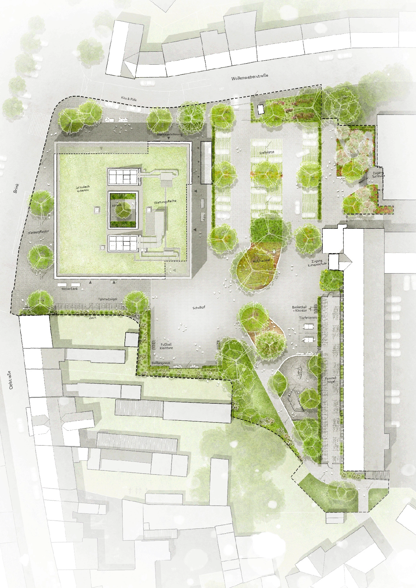 Die Gesamtschule Emmerich befindet sich in prominenter Innenstadtlage. Die Planung soll der besonderen städtebaulichen Situation an einem öffentlichen Stadtplatz Rechnung tragen und die Kombination der Schulnutzung mit einer öffentlichen Durchwegung des Grundstückes ermöglichen. Ein besonderes Augenmerk wird auf den alten Baumbestand gelegt werden, der den Ort auf beeindruckende Weise charakterisiert. Die Freianlagen, die sich um den freistehenden Neubau für die Unterstufenklassen wiederfinden, unterscheiden sich in ihrer Gestaltung je nach Nutzung. Die Außenräume differenzieren sich über Belagsflächen in geometrisch diverser Form in öffentlichen Stadtraum, Stellplatzanlage und Schulhof mit Schulgarten. Die Erschließung des Geländes erfolgt von drei Seiten. Die neue Stellplatzanlage wird von der Wollenweberstraße erschlossen und in unmittelbarer Nähe der Zufahrt befinden sich der Anlieferungsbereich der Mensa sowie der eingehauste Müllstandort. Auf dem Schulhof werden robuste Sportangebote für die Unterstufenschüler installiert. In den Bauminseln sind außerdem multifunktionale Kletter- und Relaxangebote vorgesehen. Darüber hinaus gibt es eine Vielzahl verschiedenartiger Sitzgelegenheiten, die jeweils differenzierte Aufenthaltsbereiche schaffen und somit Treffpunkte auf dem Schulhof und im Garten darstellen. Der vorhandene Bärenbrunnen kommt in der neuen Gestaltung des Schulhofes an neuralgischer Stelle zwischen Alt- und Neubau wieder als Wasserschale zum Einsatz. Der gesamte Umbau erfolgt im laufenden Betrieb der bestehenden Schulgebäude. Außerdem kam im Zuge dessen der Archäologie eine besondere Bedeutung zu.