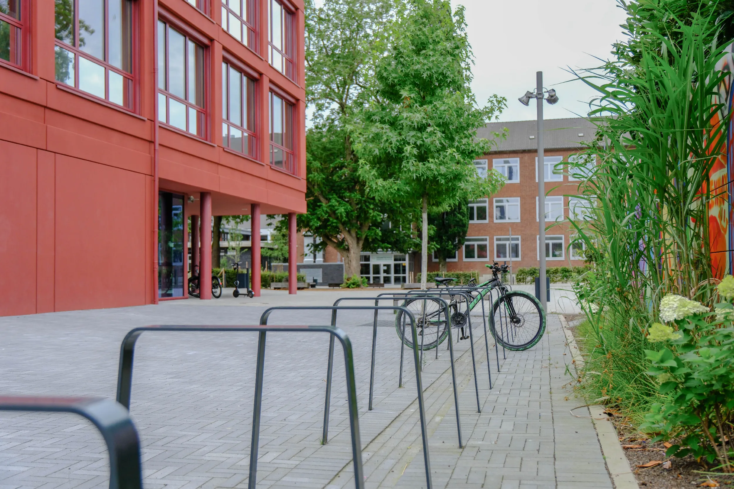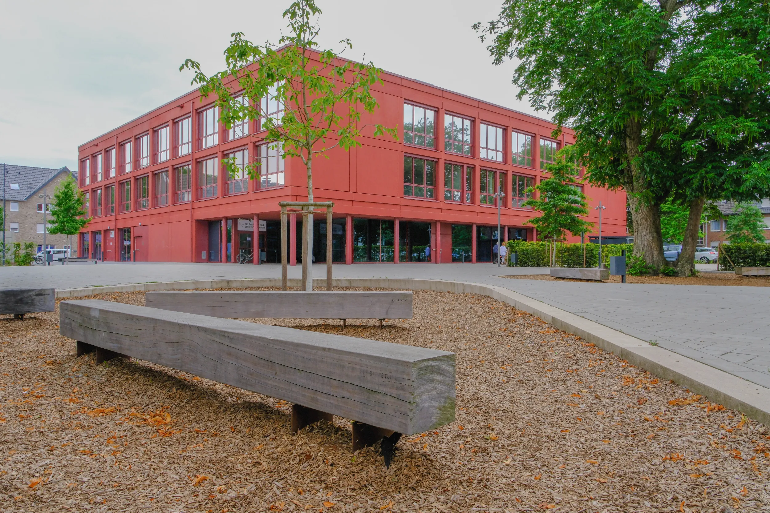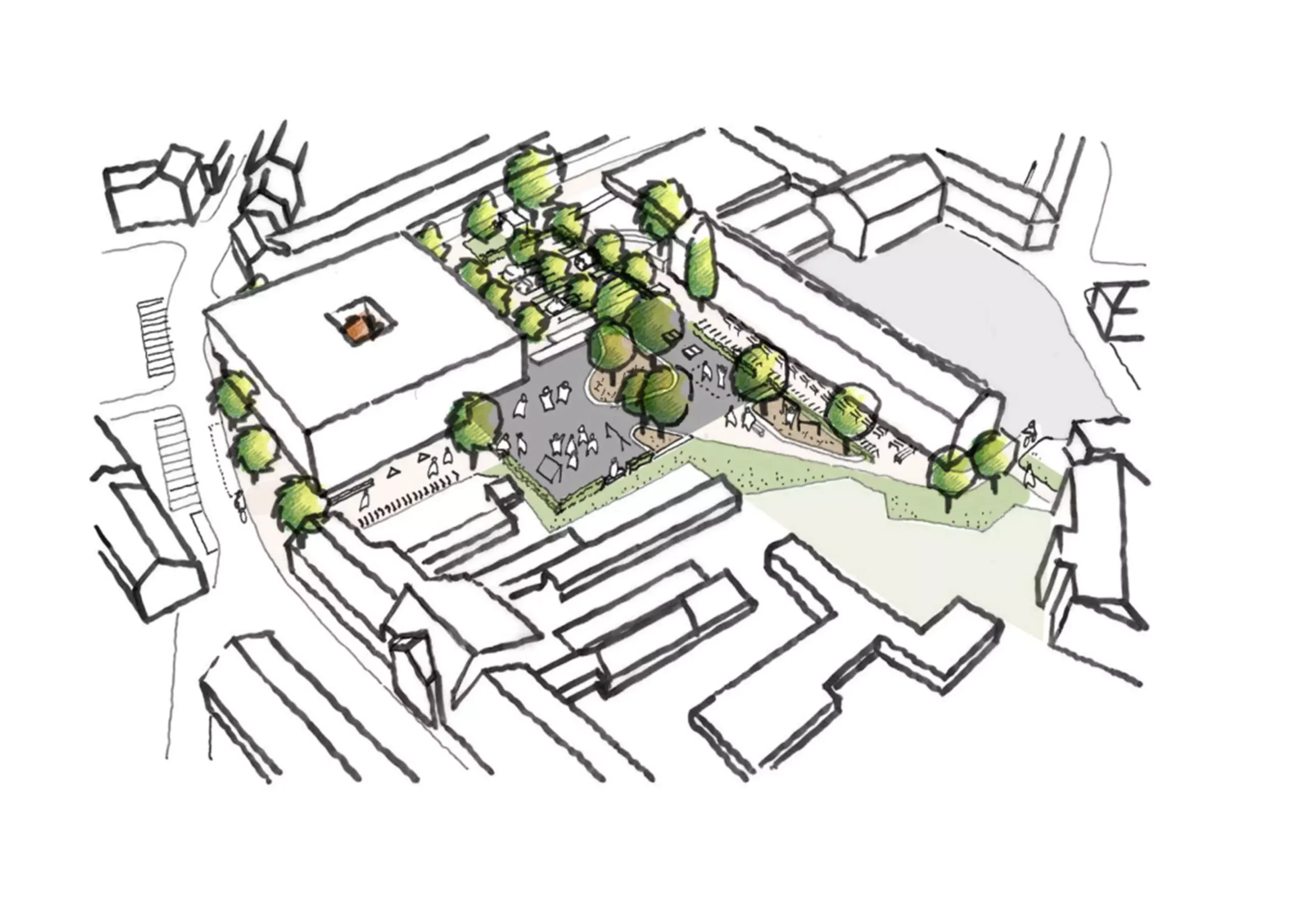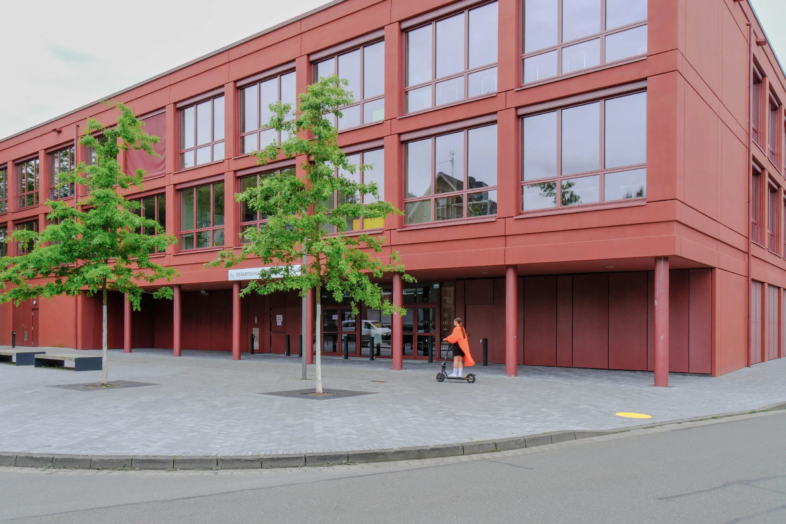 Die Gesamtschule Emmerich befindet sich in prominenter Innenstadtlage. Die Planung soll der besonderen städtebaulichen Situation an einem öffentlichen Stadtplatz Rechnung tragen und die Kombination der Schulnutzung mit einer öffentlichen Durchwegung des Grundstückes ermöglichen. Ein besonderes Augenmerk wird auf den alten Baumbestand gelegt werden, der den Ort auf beeindruckende Weise charakterisiert. Die Freianlagen, die sich um den freistehenden Neubau für die Unterstufenklassen wiederfinden, unterscheiden sich in ihrer Gestaltung je nach Nutzung. Die Außenräume differenzieren sich über Belagsflächen in geometrisch diverser Form in öffentlichen Stadtraum, Stellplatzanlage und Schulhof mit Schulgarten. Die Erschließung des Geländes erfolgt von drei Seiten. Die neue Stellplatzanlage wird von der Wollenweberstraße erschlossen und in unmittelbarer Nähe der Zufahrt befinden sich der Anlieferungsbereich der Mensa sowie der eingehauste Müllstandort. Auf dem Schulhof werden robuste Sportangebote für die Unterstufenschüler installiert. In den Bauminseln sind außerdem multifunktionale Kletter- und Relaxangebote vorgesehen. Darüber hinaus gibt es eine Vielzahl verschiedenartiger Sitzgelegenheiten, die jeweils differenzierte Aufenthaltsbereiche schaffen und somit Treffpunkte auf dem Schulhof und im Garten darstellen. Der vorhandene Bärenbrunnen kommt in der neuen Gestaltung des Schulhofes an neuralgischer Stelle zwischen Alt- und Neubau wieder als Wasserschale zum Einsatz. Der gesamte Umbau erfolgt im laufenden Betrieb der bestehenden Schulgebäude. Außerdem kam im Zuge dessen der Archäologie eine besondere Bedeutung zu.