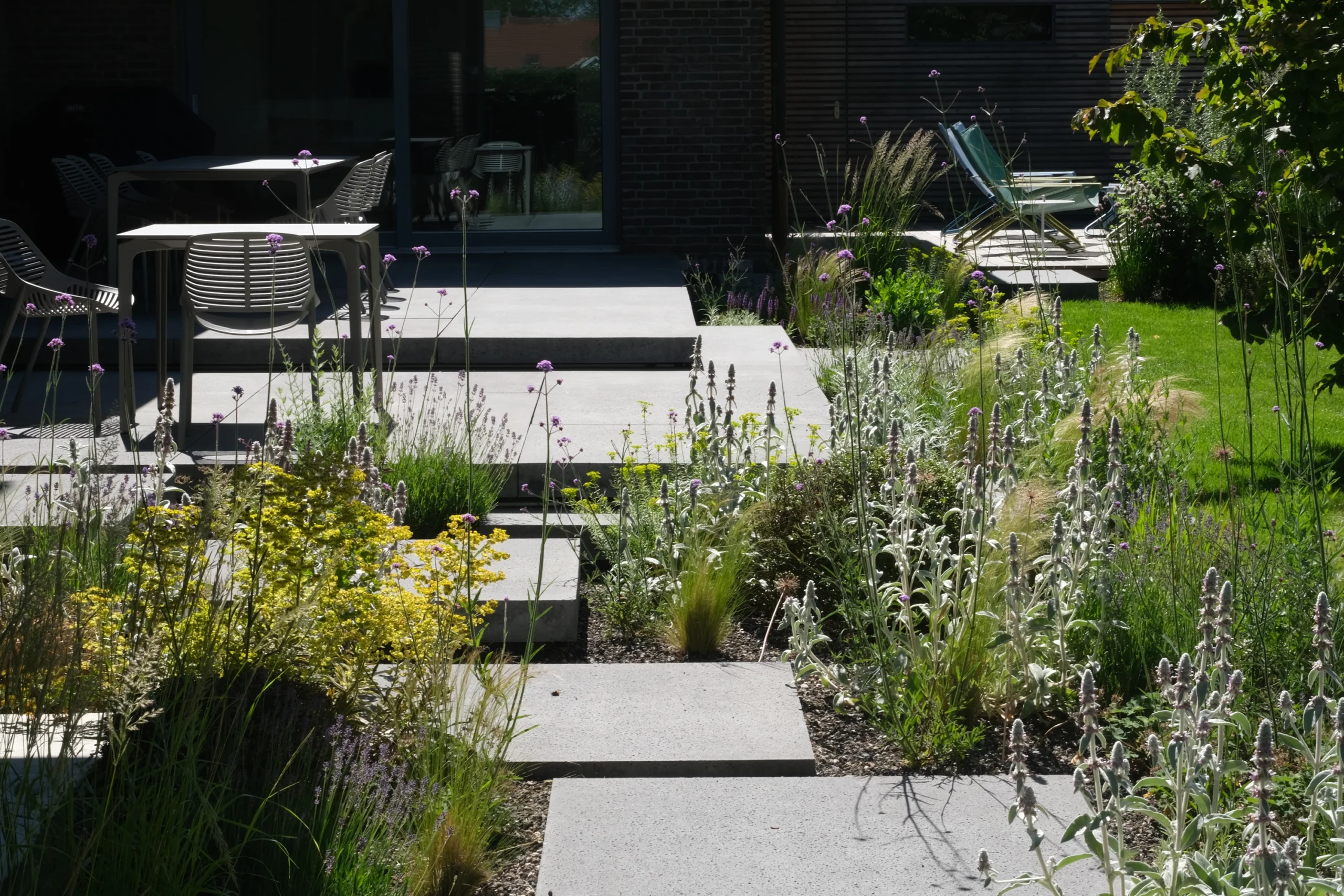 In eine Splittfläche eingelassene Platten mit dazwischen eingestreuten Gräsern und Stauden, schaffen ein abwechslungsreiches und attraktives Bild des Gartens, und die daran angrenzende Rasenfläche dient den Kindern als Spielfläche. Der seitlich gelegene Poolbereich wird von einer Holzterrasse gefasst. Der Bereich wird von blühenden Stauden und höheren Gräsern gerahmt, wodurch ein eigener Gartenraum entsteht. Gleichzeitig bieten zahlreiche blühende Pflanzen fast ganzjährig so viel Nahrung für Insekten, dass Bienen, Wespen und Falter stetige Begleiter sind.