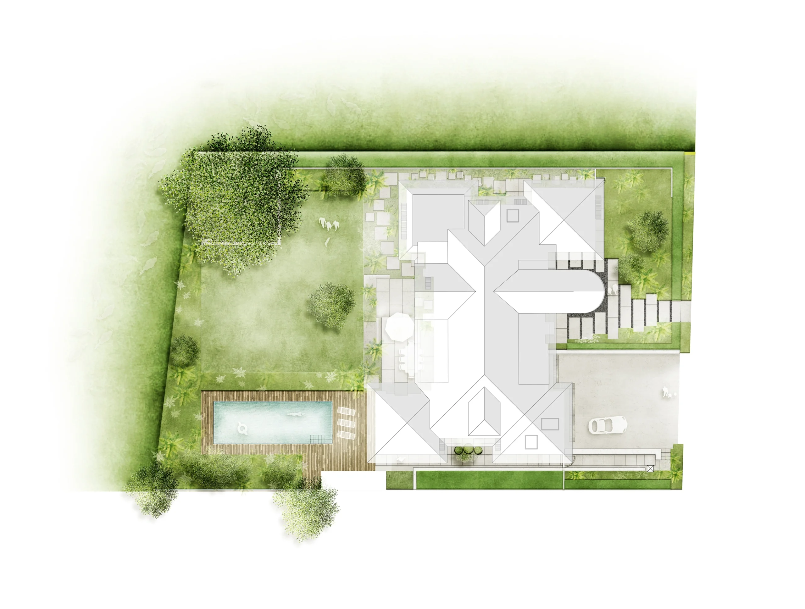 Am Stadtrand von Aachen, direkt am Weideland, steht ein Wohnhaus aus den achtziger Jahren. Dem robust verklinkerten Gebäude war eine ebenso wehrhafte Terrasse vorgelagert und der Vorgarten war gänzlich mit Schotter bedeckt - eine unpassende Adresse für eine Familie mit drei Kindern. Letztlich war jedoch der Wunsch der Kinder nach einem Pool im Garten der entscheidende Anstoß uns mit der Umgestaltung des Gartens zu beauftragen.