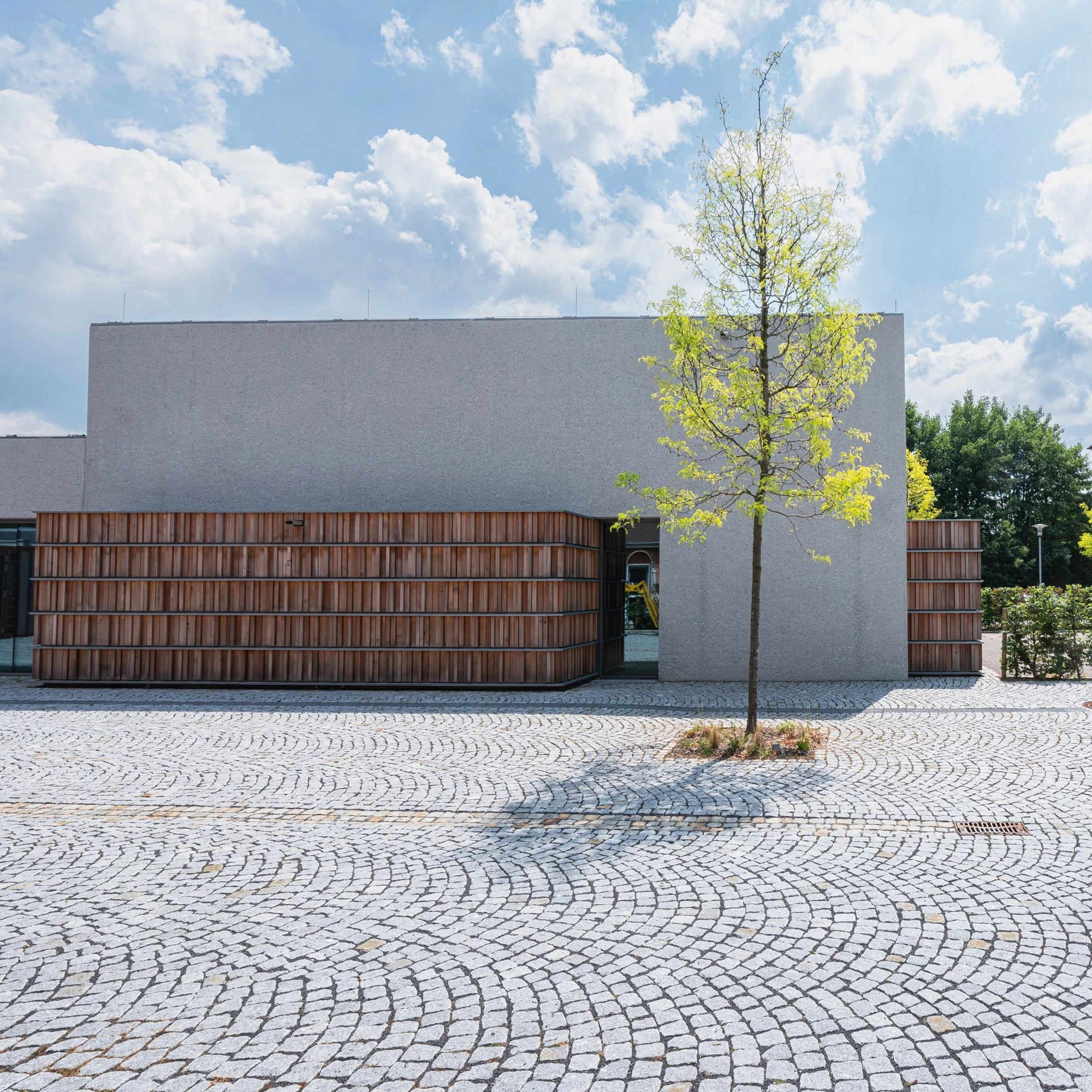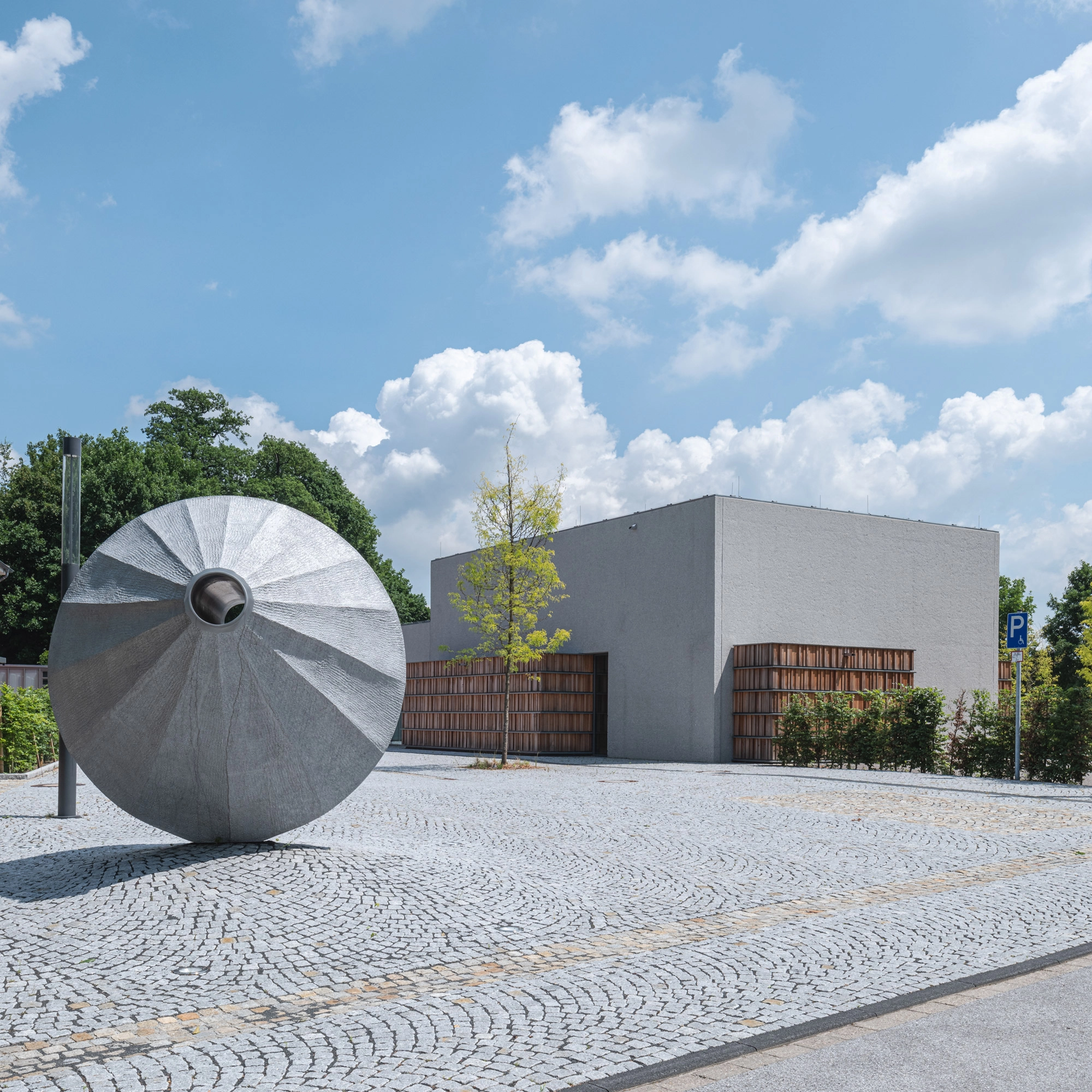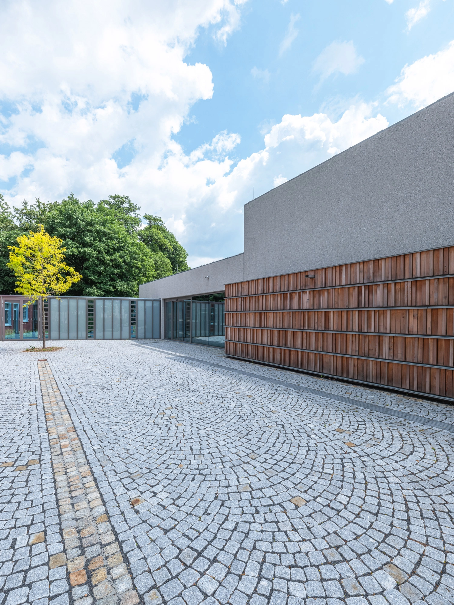 Der Vorplatz aus Natursteinpflaster bildet einen ansprechenden Auftakt des Zentrums und dient der Haupterschließung der Bibliothek. Das Gebäude wird dadurch präsenter im öffentlichen Raum positioniert und öffnet sich zugleich einladend zur Straße hin. Eine Skulptur der Künstlerin Prof. Leunora Salihu setzt auf dem freien Vorplatz einen markanten gestalterischen Akzent. Räumlich gefasst wird der Platz durch die Bibliothek, das Gästehaus und einen geschlossenen Verbindungsgang.