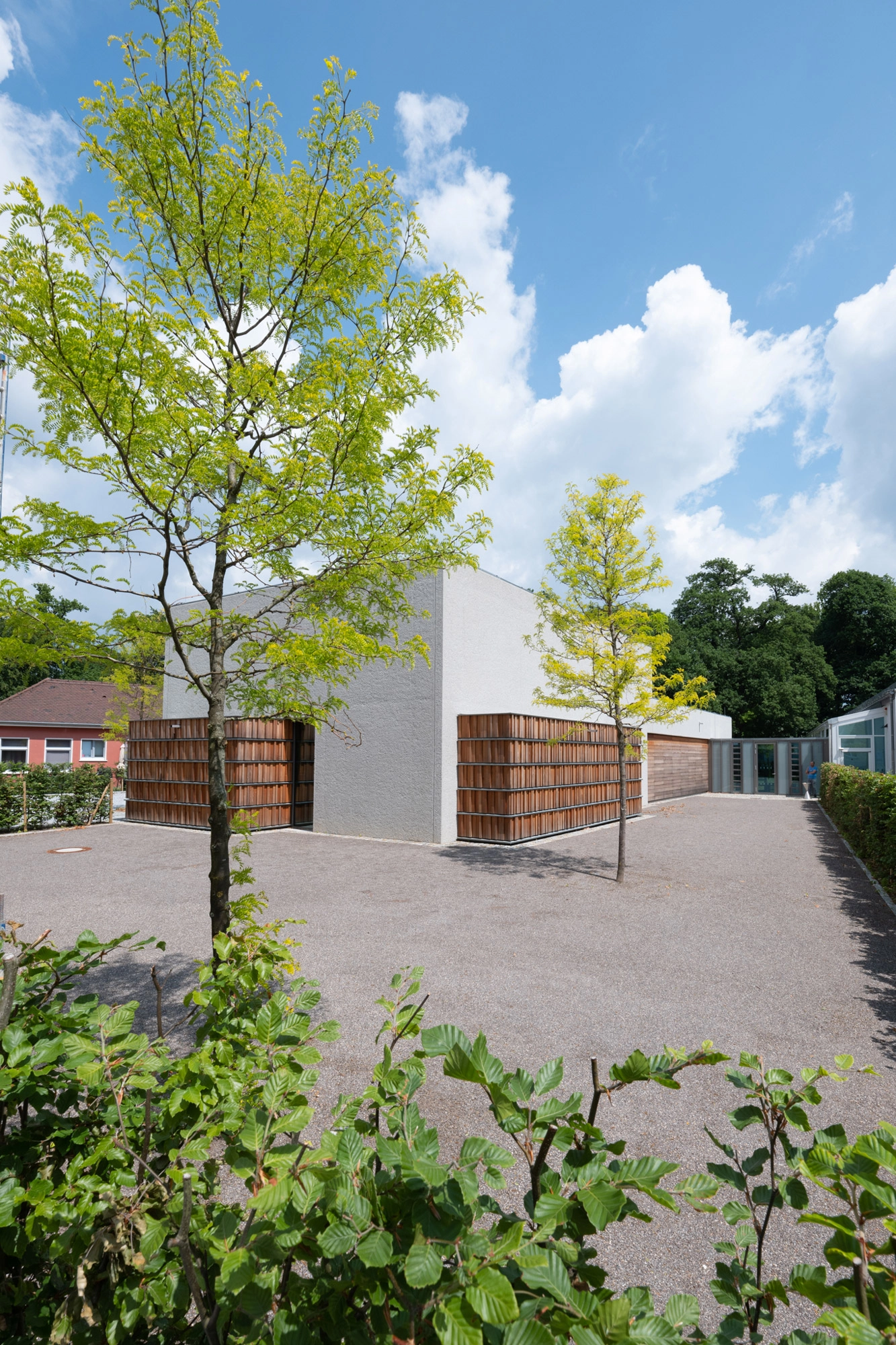 Der seitliche Lesegarten, umgeben von einer dichten Buchenhecke, bietet einen ruhigen Rückzugs- und Veranstaltungsort, der auch für Ausstellungen genutzt werden kann. Der wassergebundene Bodenbelag ermöglicht diese flexible Nutzung und fügt sich harmonisch in das Gesamtbild, indem er die Farbigkeit der Fassade aufgreift.