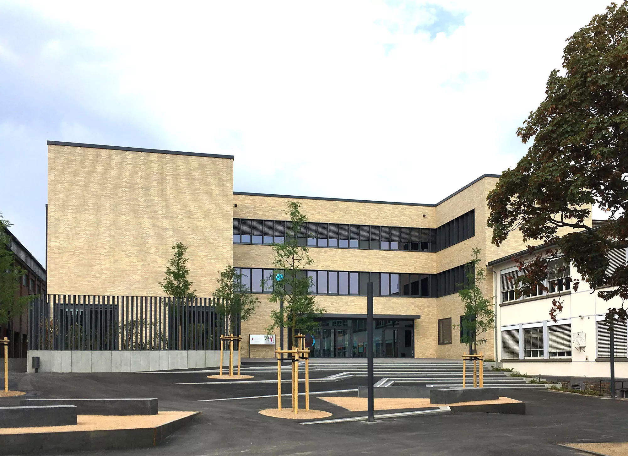 Zusätzlich zu den baulichen Umstrukturierungsmaßnahmen der Schule wird ebenfalls der Schulhof neu konzipiert und auf die Schulform abgestimmt. Die östlichen und westlichen Schulhofflächen werden durch den Erweiterungsbau voneinander getrennt, weshalb sich auch die Gestaltungskonzepte klar voneinander abheben. Der östliche Schulhofbereich ist in erster Linie befestigt, wohingegen der westliche Schulhof soweit wie möglich begrünt wird.