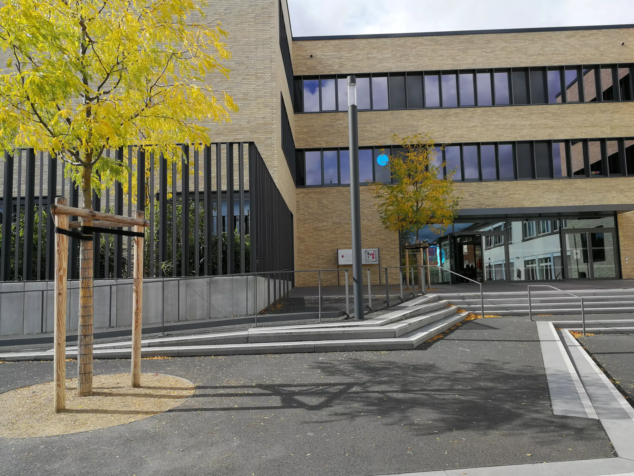 In die Schulhoffläche eingestreute Baumpflanzungen sorgen nicht nur für Schatten und Kühlung, sondern bieten ein schönes Licht- und Schattenspiel auf der homogenen Bodenfläche.