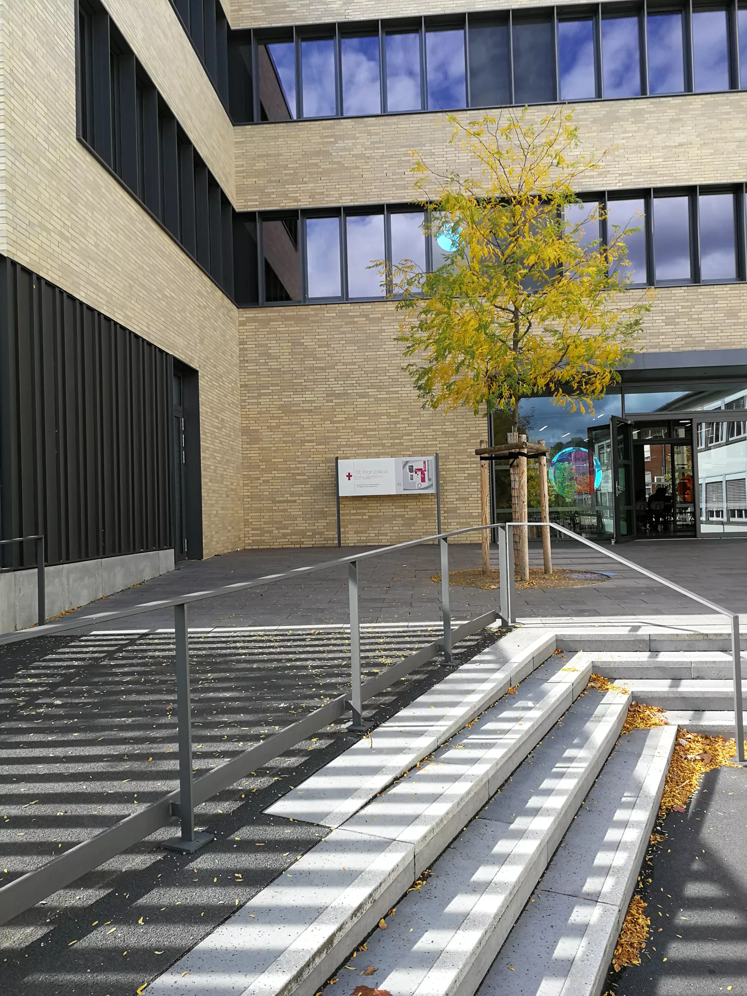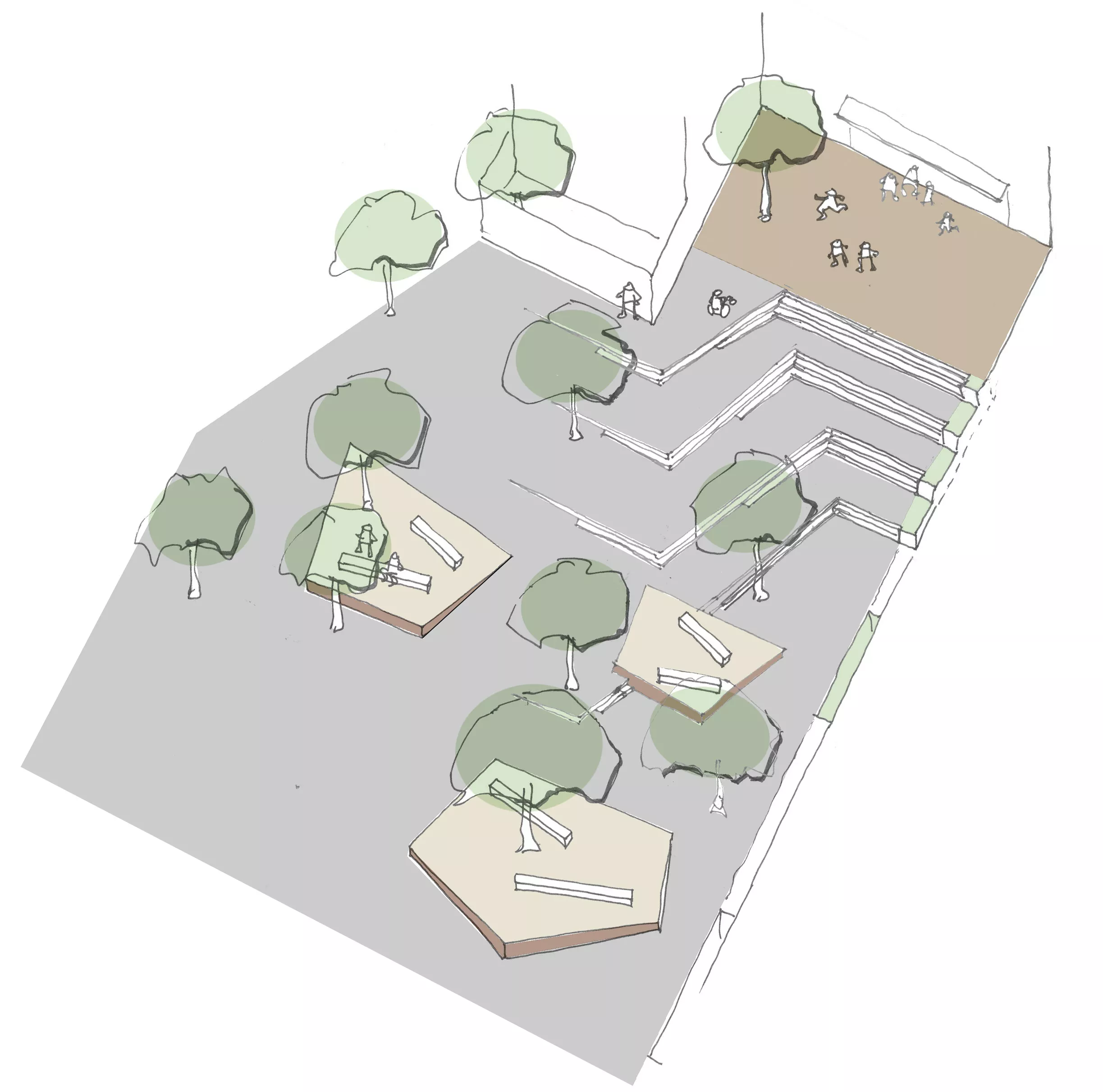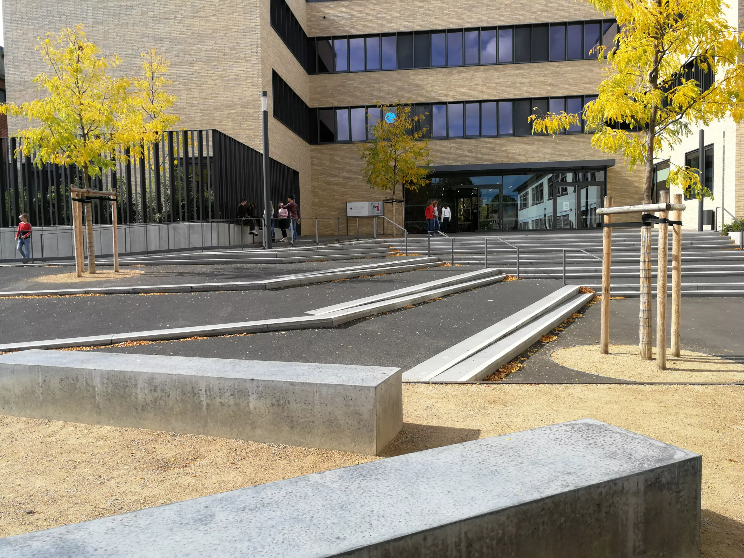 Im südlichen Abschnitt des Schulhofs wird der Höhenunterschied des Geländes in Form einer geneigten Fläche ausgebildet, um auch als barrierefreie Zuwegung zu dienen. Um die Strenge des Schulhofs aufzulockern sind in die Fläche unregelmäßig geformte Inseln mit einer Oberfläche aus wassergebundener Decke eingefügt. Die Inseln sind mit informellen Sitzangeboten ausgestattet und dienen als Treff- und Kommunikationspunkte für die Schülerinnen und Schüler.